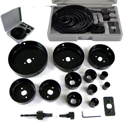 New 16pc Holesaw Set which includes 13 carbon steel holesaws, 2 arbors, 1 reinforced metal plate and 1 allen key. Includes sizes 19, 22, 25, 28, 32, 38, 44, 51, 64, 76, 89, 102, 127mm holesaws. Suitable for cutting accurate holes in timber, plastic, fibreglass, chipboard, craftboard, plaster, drywall, aluminium and thin sheet metal. Come complete with blow moulded storage case.