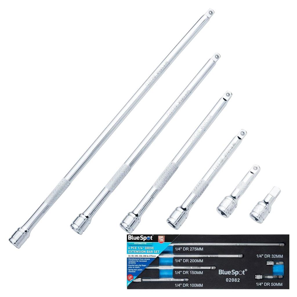 The Blue Spot Tools 6 PCE 1/4" Extension Bar Set is manufactured from heat treated chrome vanadium for increased durability. Each extension bar has a knurled non-slip finger grips on the shafts for extra grip. Spring-loaded ball bearing for secure socket holding.