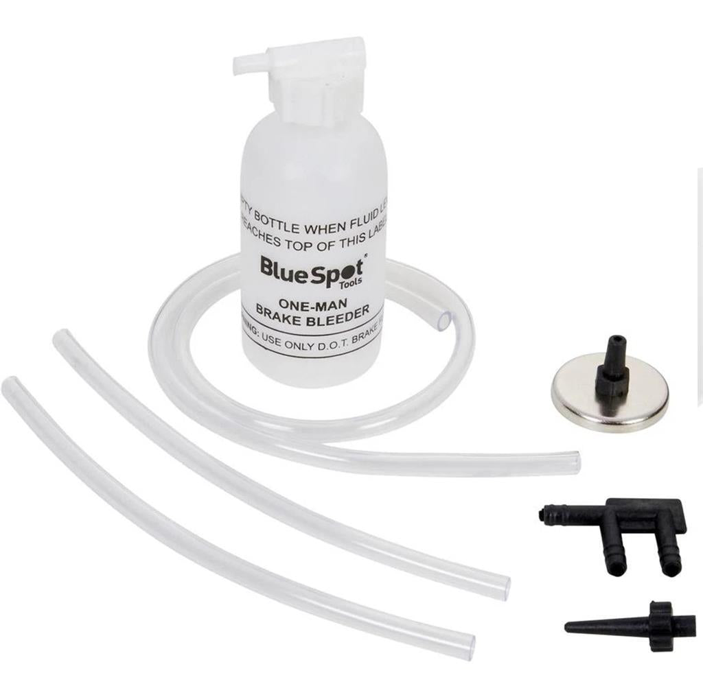 The Blue Spot mini one person brake bleeder kit enables the user to bleed brakes without any assistance it comes with a strong magnet to keep the 2oz (60ml) fluid bottle in place along with different sized hoses and tapered fittings which are compatible with most cars designed to be used on master cylinders, wheel cylinder and calipers.