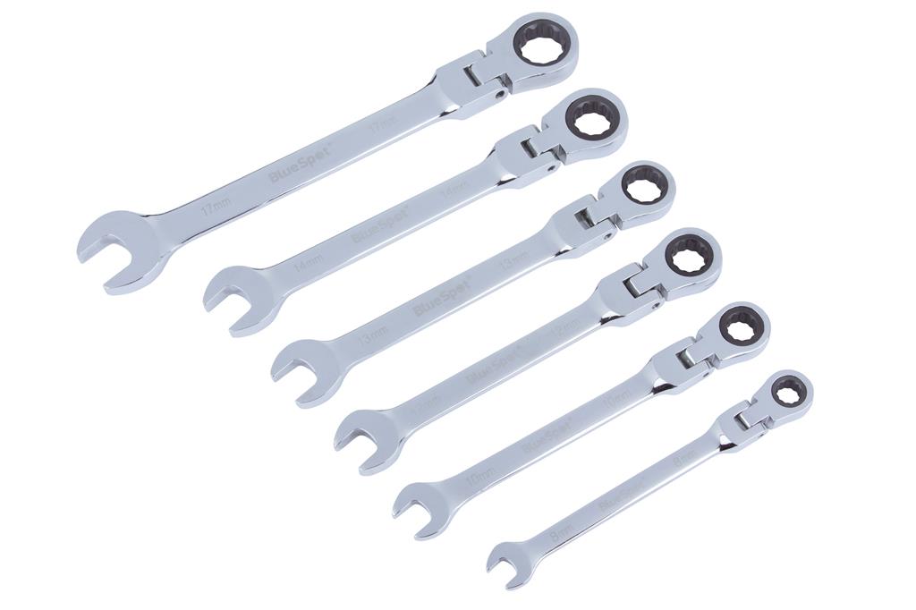 The Blue Spot Tools 6 Piece Flexible Metric Ratchet Spanner Set features 180° pivoting ratchet ring heads. Manufactured from heat treated carbon steel with a chrome vanadium ratchet head for increased durability. 8° ratcheting increments make set ideal for use in tight spaces. Fully polished mirror finish.
