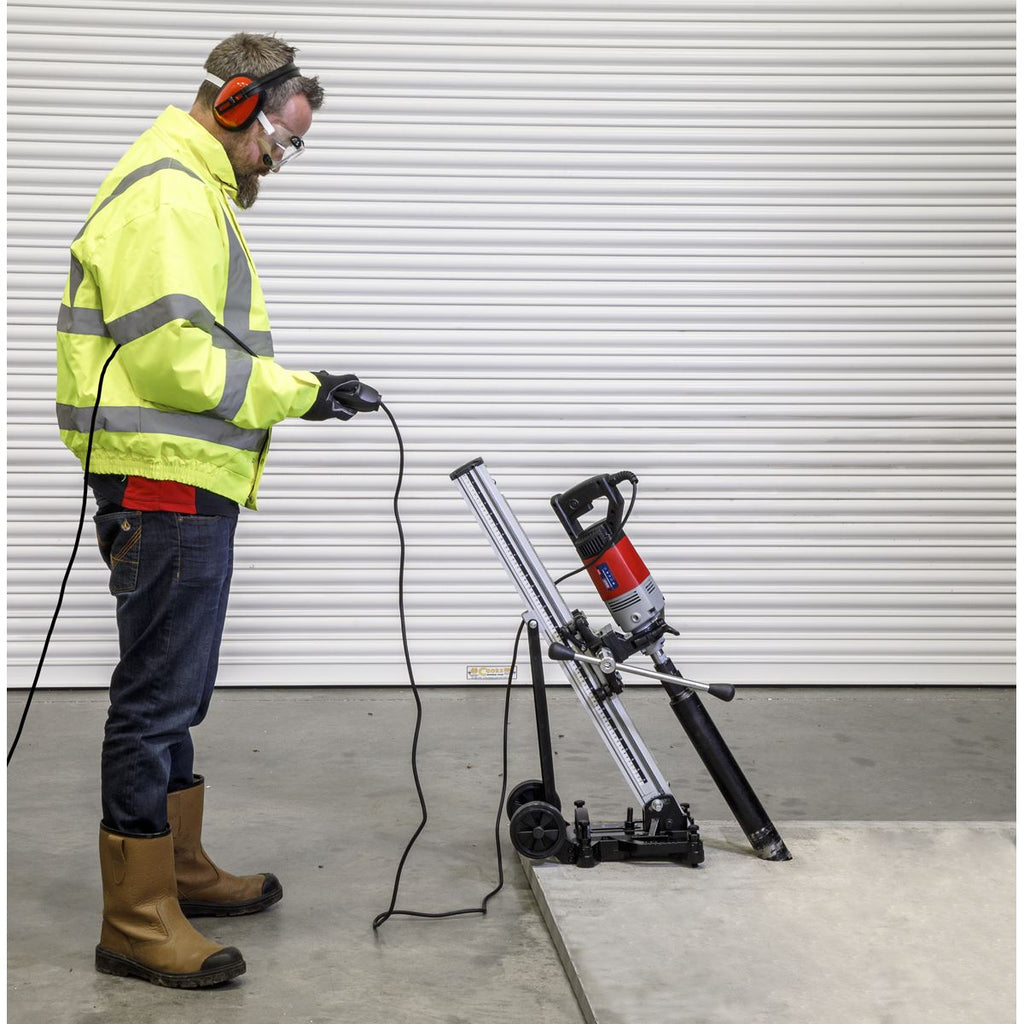 Lightweight aluminium diamond core drill stand features tilting mechanism and base plate with anchor fitting. Handle and wheels for ease of transport. Ideal for use with Model No's DCD110V and DCD230V Diamond Core Drills.