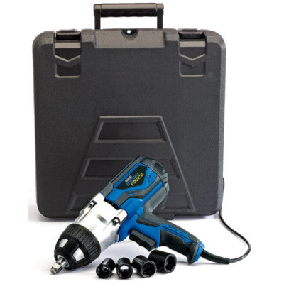 Powerful electric impact wrench and socket kit, ideal for mechanics, steel erectors, fitters, engineers and car enthusiasts. The massive 480Nm of torque makes light work of removing rusted-on or overtightened nuts and bolts. The ergonomic design is both lightweight and fitted with a soft grip anti slip handle, providing comfort even when used for prolonged periods. Fitted with a full metal gear box, an electric brake, thermal overload protection, variable speed forward/reverse rocker switch trigger and 6M of rubber cable and approved plug. Supplied with 4 x impact sockets 17, 19, 21, 23mm and a hardwearing plastic carry case.