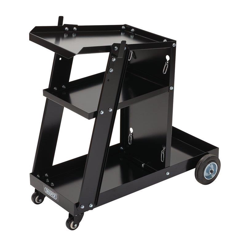 This heavy-duty all-metal welding cart has three shelves for organising welding equipment and accessories. It can transport ARC and MIG welders and plasma cutters up to 440 x 257mm and a standard/large sized industrial gas bottle, secured using the 750mm fitted chain. It is designed for durability and made of thick steel with a black powder-coated finish. There are two large 125mm rear wheels and heavy-duty swivel castors at the front for easy manoeuvrability. Maximum capacity is 50kg