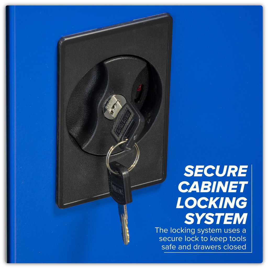 Industrial quality, double door, freestanding cabinet with three shelves and two drawers. Unit easy to assemble with minimal tools required. Durable, scuff resistant, adjustable shelves, each holding up to 150kg. Drawers run on heavy-duty ball-bearing drawer slides with a load bearing of up to 75kg. Reinforced steel doors with zinc plated locking bars providing 3-point locking mechanism. Supplied with two coded keys. Ideal for home, office, garage or workshop use.
