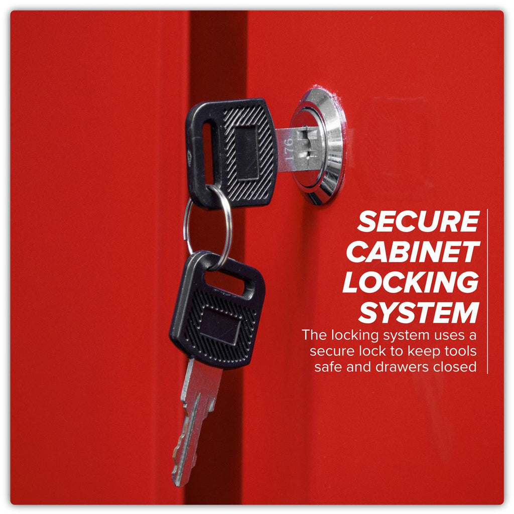 Features perforated pegboards on the inside of each door, ideal for tool storage.
