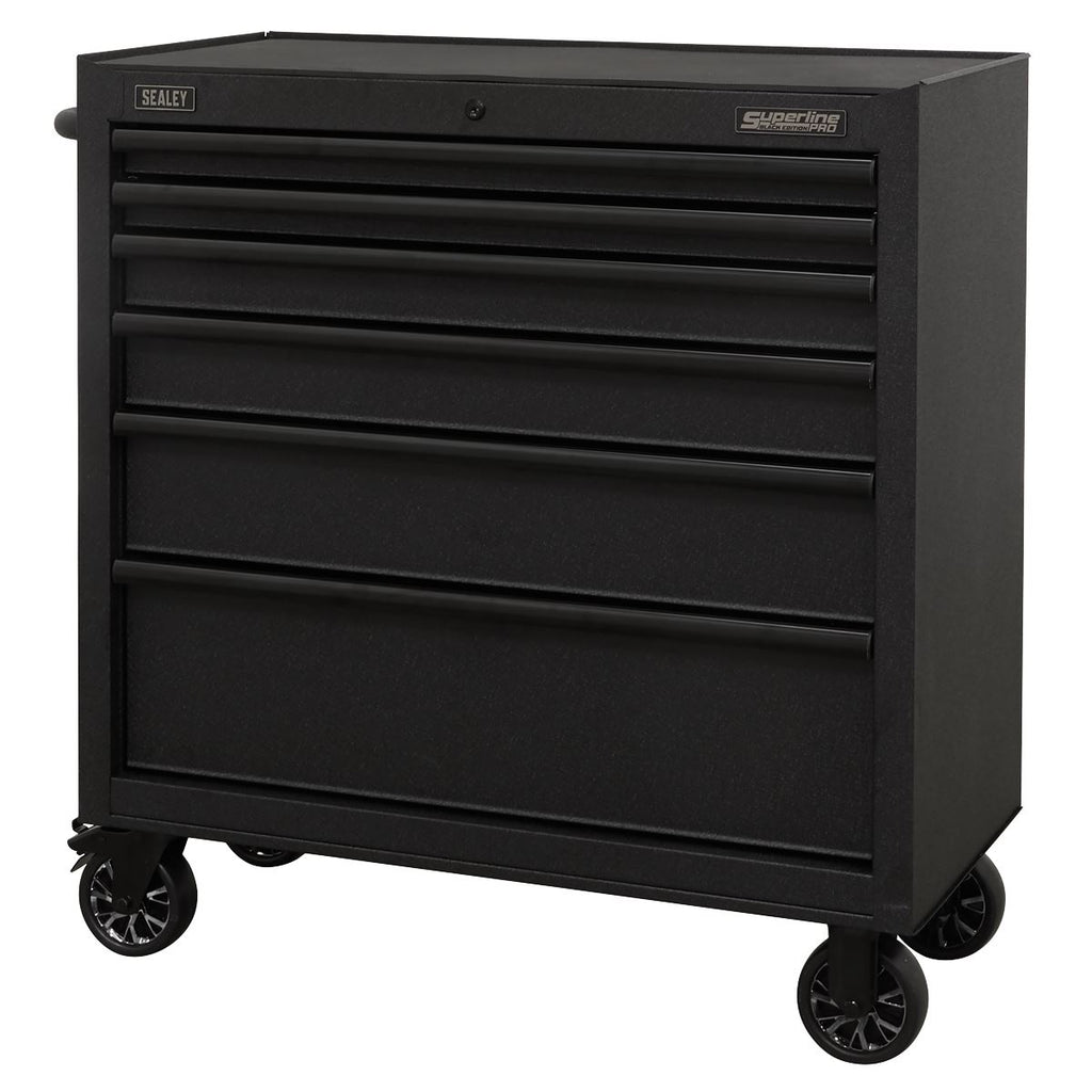 All heavy-duty steel construction and manufactured with steel inner walls for extra strength and durability. Heavy-duty 45mm ball-bearing drawer slides provide superior performance, suitable for heavier loads. Full height rear locking mechanism, locks smooth running soft close drawers in place. Rust and solvent resistant black crinkle effect finish. Fitted with four 125mm PP wheels with black chrome effect alloys, two castors with quick release anti-rotation toe locks and two fixed wheels. Side handle for added comfort when manoeuvring around the workplace. Each drawer features stylish black anodized heavy-duty drawer pulls plus pre-cut non-slip liners. Supplied with two folding keys.