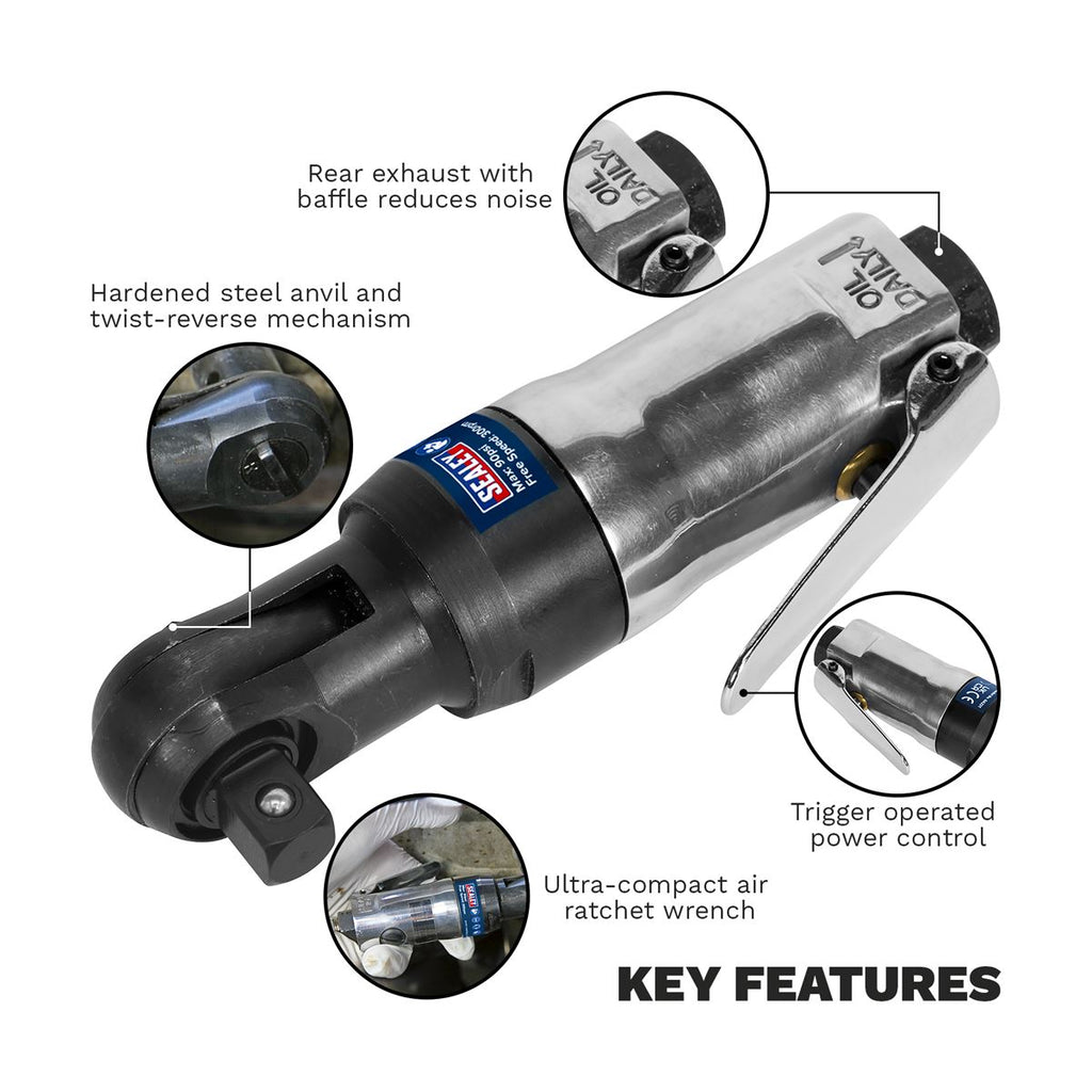 Ultra-compact air ratchet wrench fits in the palm of the hand. Perfect for working around tightly-packed engine compartments. Hardened steel anvil and twist-reverse mechanism. Rear exhaust with baffle reduces noise.