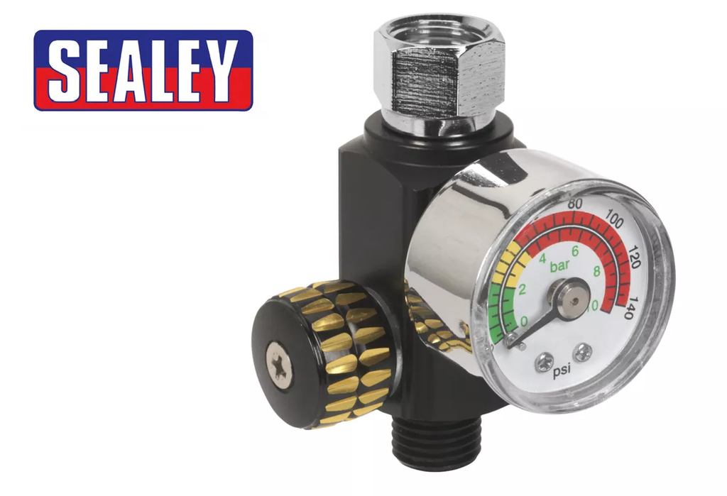 On-Gun Air Pressure Regulator/Gauge. Couples directly to spray gun air inlet to control air flow and pressure. Max. Pressure/Flow: 140psi/17cfm @ 60psi. Just one of a comprehensive range of quality spray gun accessories.