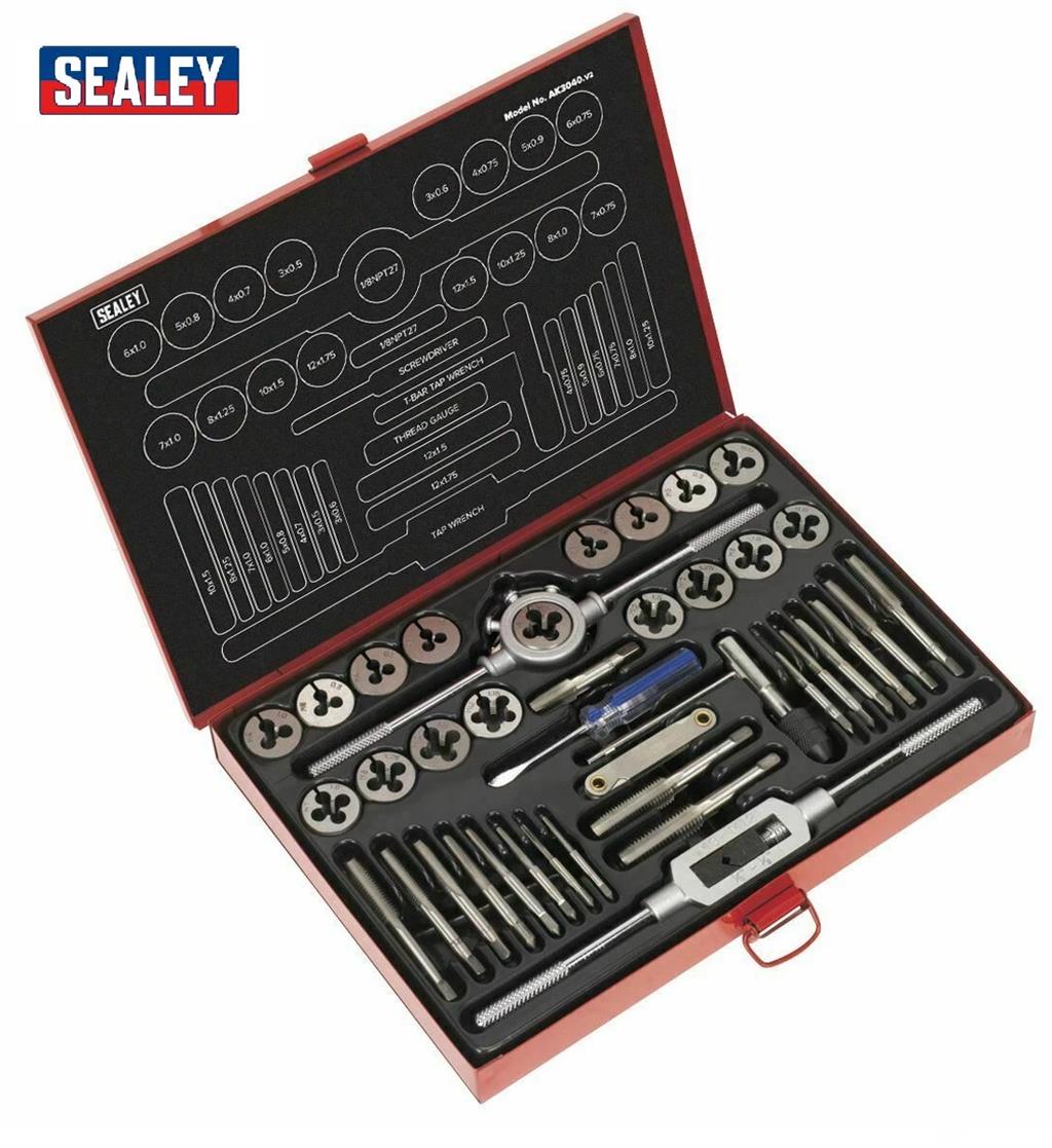 High quality alloy steel taps and dies. Split dies with machined lead-ins for ease of use. Die holder features self-centring mechanism for straight and accurate thread cutting. Set also includes T-handled tap wrench and Metric screw pitch gauge. Supplied in storage case.