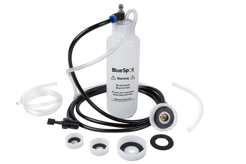 The Blue Spot Tools One Person Brake And Clutch Bleeder Kit enables the user to extract and replace brake fluid at the same time, using the air pressure from your spare tyre ( max 20PSI - 10PSI for older systems). The kit comes complete with a 500ml container with a magnetic base which keeps it in situ during use as well as brake bleed tubes of various sizes and a range of common sized reservoir caps suitable for most vehicle types.