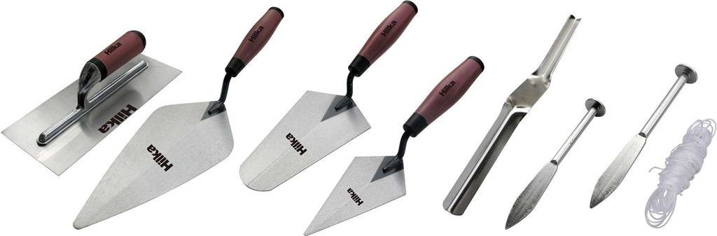 Contents: 11" brick trowel, 11" plastering trowel, 7" gauging trowel, 6" pointing trowel, double ended brick jointer trowel, pair of line pins with string.