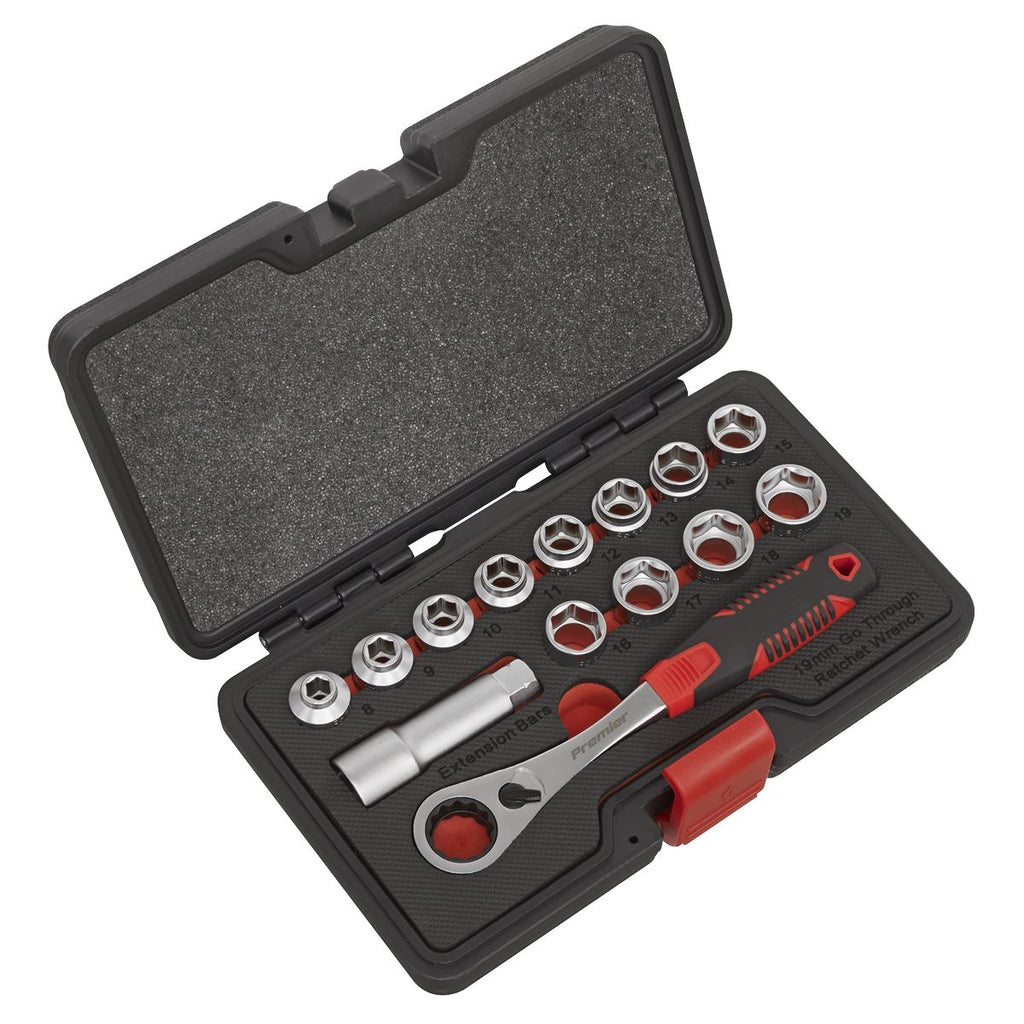 Manufactured from hardened and tempered Chrome Vanadium steel with a fully polished micro satin finish. Low profile sockets with a projected length of just 13mm, ideal for use under dashboards and on auxiliary belts as well as any other application where access is restricted. Go-through design for nuts on extended studs and adjusting screw locknuts. Sockets range from 8-19mm. Includes go-through extension. Flip reverse, 72-tooth ratchet wrench with push-through socket release. Supplied in storage case.