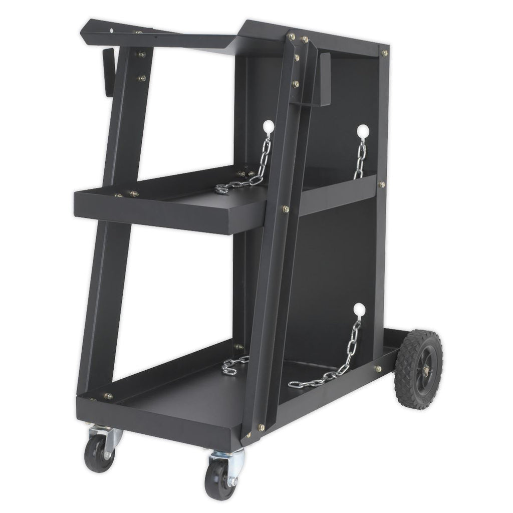 Robust trolley carries portable MIG welder and gas bottle, making relocation of welding equipment quick and easy.