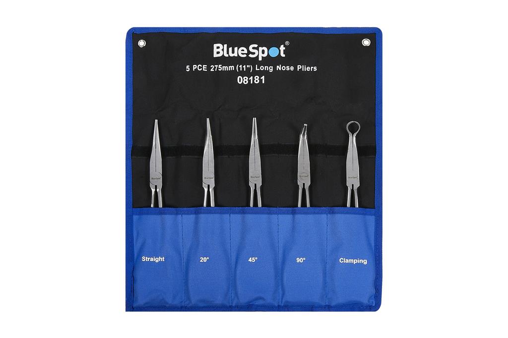 The Blue Spot Tools 5 PCE 275mm (11") Long Nose Pliers are manufactured from chrome vanadium steel for increased durability. Soft-grip handles for increased comfort. Set includes straight, 20°, 45°, 90°, clamping plier. 13mm hole diameter. Supplied in wallet.